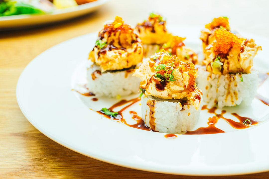 Indulge in our Dragon Roll, featuring tempura shrimp and cucumber inside, topped with sliced avocado, eel sauce, and sesame seeds, creating a visually stunning and delicious roll.